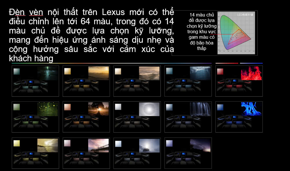 Lexus ES 250 2025 trang bị đèn viền nội thất sang trọng với 64 màu sắc và 14 chủ để giúp tối đa tính cá nhân hóa của chủ xe.