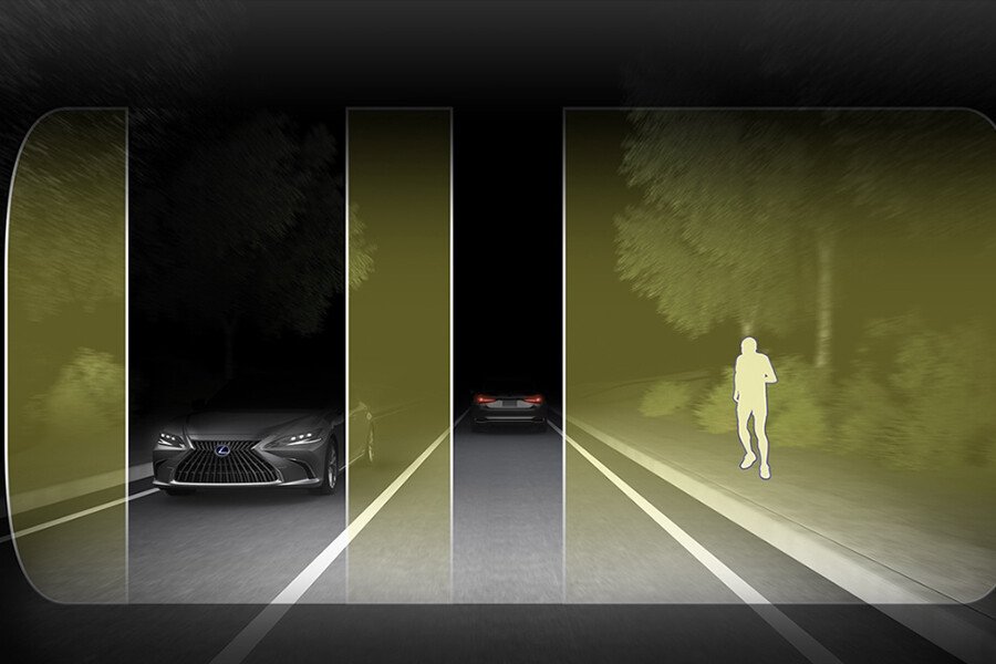Hệ thống đèn pha tự động thích ứng AHS-Blade Scan trên xe Lexus ES 250 tối ưu hóa sự phân bố đèn pha để ánh đèn không chiếu thẳng vào xe ngược chiều hoặc xe đi trước.