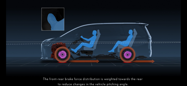 Lexus LM500h trang bị hệ thống kiểm soát tư thế xe (Kiểm soát mấp mô thân xe). Trong quá trình phanh, sự phân bổ lực phanh trước-sau thay đổi tùy thuộc vào lực phanh của người lái và tác động theo phương thẳng đứng của hệ thống treo. Lực phanh được dồn về phía sau để giảm sự thay đổi độ cao và ngăn chặn lực nâng đuôi xe, do đó cải thiện chất lượng di chuyển của hàng ghế sau và giảm thiểu chuyển động từ trước ra sau.