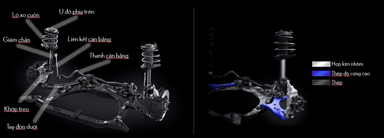 Hệ thống treo tay đòn kép thích ứng (AVS) với van tần số siêu nhạy trên Lexus LM500h giúp giảm sốc và các rung động tần số từ thấp đến cao khi lái xe qua mặt đường gồ ghề, mang đến trải nghiệm êm ái và thoải mái tuyệt vời cho hành khách phía sau.