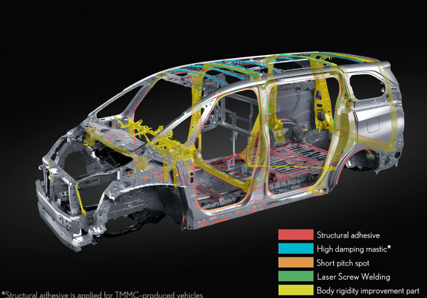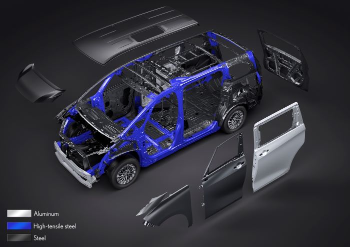 Khung thân xe Lexus LM500h sử dụng nền tảng TNGA-K kết hợp vật liệu thép cường lực giúp và gia cố thêm những điểm yếu ở khung xe thế hệ tiền nhiệm cấu trúc thân xe mới cứng vững ổn định hơn khi vào cua