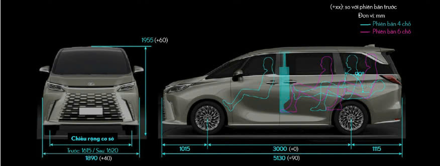 Lexus LM500h sở hữu thân hình bề thế với kích thước tổng thể DxRxC lần lượt là 5130 mm x 1890 mm x 1955 mm. LM500h có chiều dài cơ sở là 3000 mm, khoảng sáng gầm xe là 165 mm.