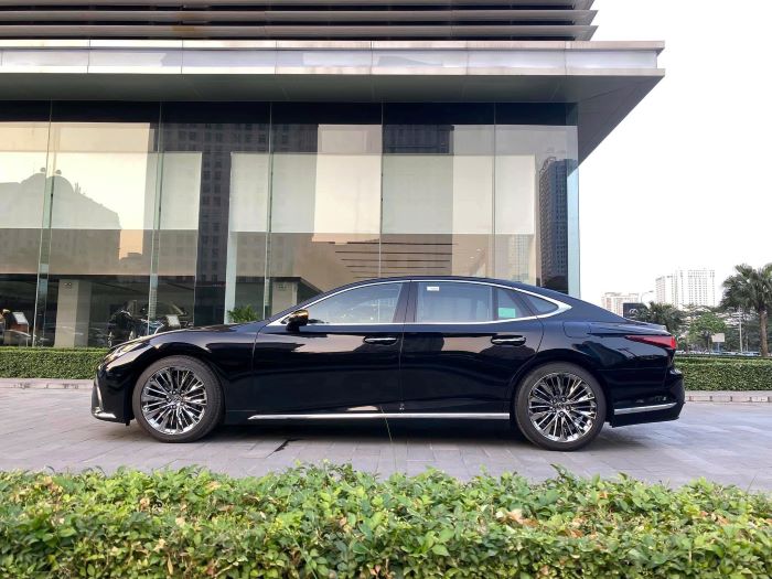 Thân xe Lexus LS500 có đường dập nổi khỏe khoắn tạo sự nổi bật cùng 2 vành xe 20 inch sáng bóng dạng đa chất giúp giảm tiếng ồn. Gương chiếu hậu ngoài xe được sơn 2 màu hài hòa với tổng thể chiếc xe.
