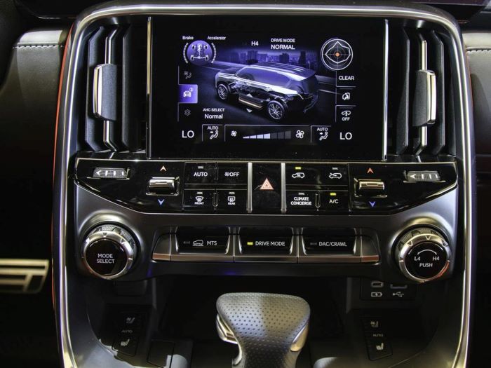 Màn hình Lexus LX 600 F Sport là loại kép gồm màn hình chính 12.3 inch cho điều khiển trung tâm và màn hình phụ 7 inch hỗ trợ thông tin off-road và điều hòa có kết nối Apple Carplay và Android Auto tiện lợi.