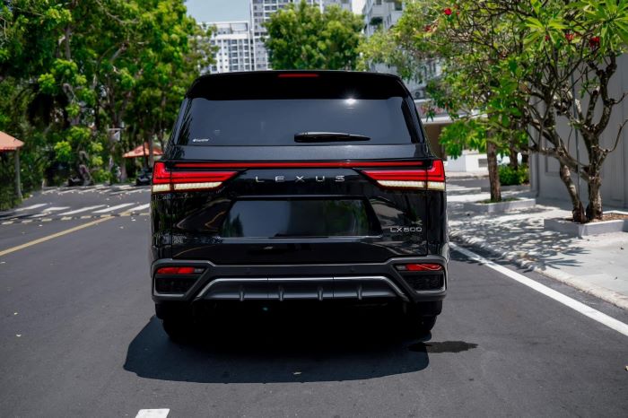 Thiết kế phía sau Lexus LX 600 Sport thể hiện rõ nét đặc trưng mới của thương hiệu với dải LED nối liền hai bên cùng dòng chữ "LEXUS" ở trung tâm
