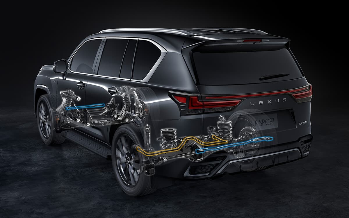 Hệ thống treo thích ứng AVS (Adaptive Variable Suspension) liên tục điều chỉnh hệ số giảm chấn của bộ giảm chấn giúp tăng lái thể thao của Lexus LX 600 F Sport.