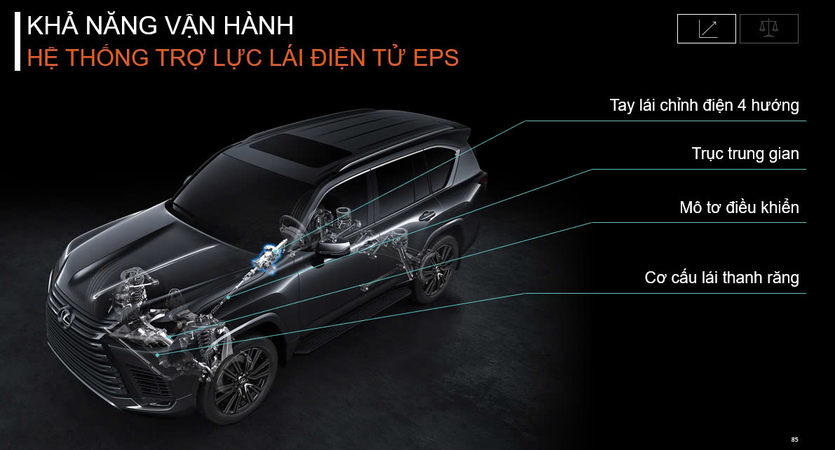 Hệ thống lái trợ lực điện EPS mới trên Lexus LX 600 F Sport giúp điều khiển xe chính xác vào cua mượt mà trên mọi địa hình.