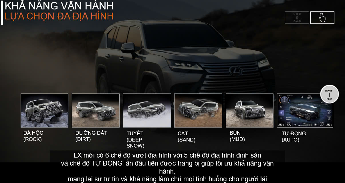 Lexus LX 600 Urban có 6 chế độ lái sẽ tự động lựa chọn chế độ lái lý tưởng phù hợpvới điều kiện địa hình trước mắt.
