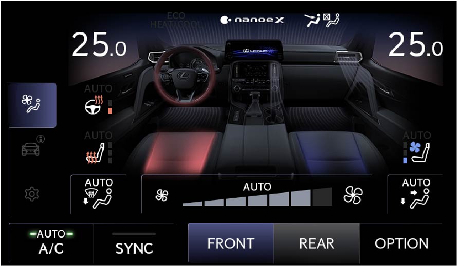 Chức năng Climate Concierge & S-FLOW điều chỉnh phối hợp hệ thống điều hòa, làm mát/sưởi ghế, sưởi vô lăng để nhanh chóng mang đến cho mỗi hành khách sự thoải mái trong mọi điều kiện thời tiết. Khi trên ghế không có người ngồi, chức năng làm mát/sưởi ghế sẽ tự động TẮT để tăng cường khả năng tiết kiệm nhiên liệu cho Lexus LX 600 Urban.