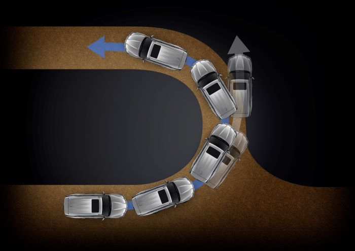 Chức năng Hỗ trợ vào cua góc hẹp (Turning Assist) có thể kích hoạt trên màn hình cảm ứng 7-inch trong lúc chế độ Kiểm soát tốc độ vượt địa hình (Crawl Control) đang vận hành, giúp người lái dễ dàng điều khiển xe vượt qua các khúc cua hẹp bằng cách phanh hãm bánh xe phía trong để làm giảm bán kính quay vòng của xe Lexus LX 600 Urban.