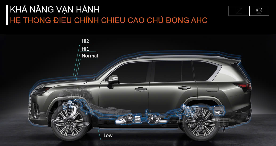 Hệ thống treo điều chỉnh độ cao chủ động (AHC) trên Lexus LX 600 Urban cho phép người lái điều chỉnh độ cao theo các điều kiện mặt đường, đem tới độ thoải mái và độ ổn định tối ưu trên mọi hành trình.