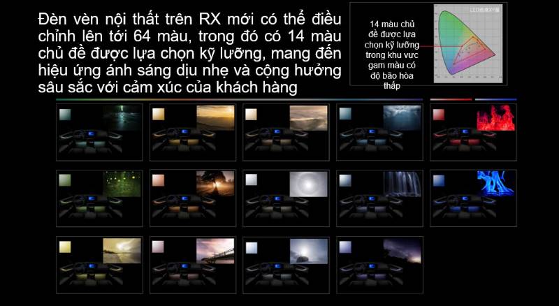 Hệ thống đèn nội thất với 64 màu và 14 chủ đề giúp tạo không gian thư giãn, cá nhân hóa cho chủ xe.